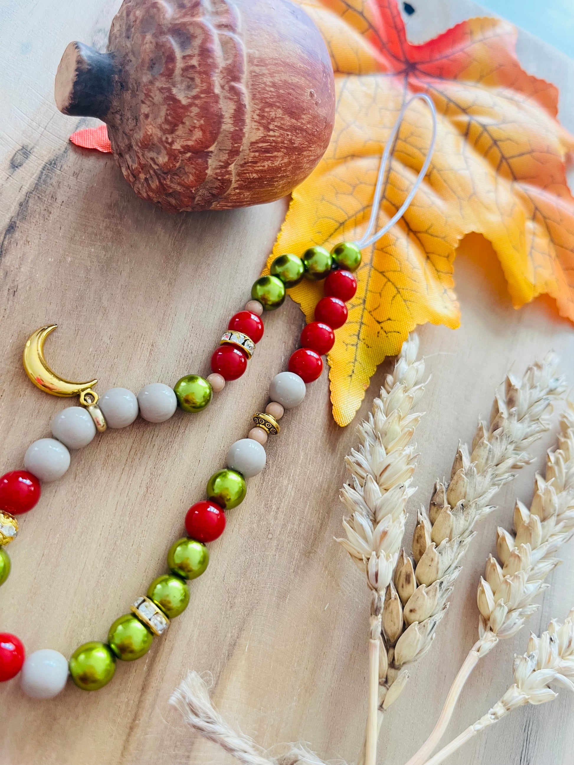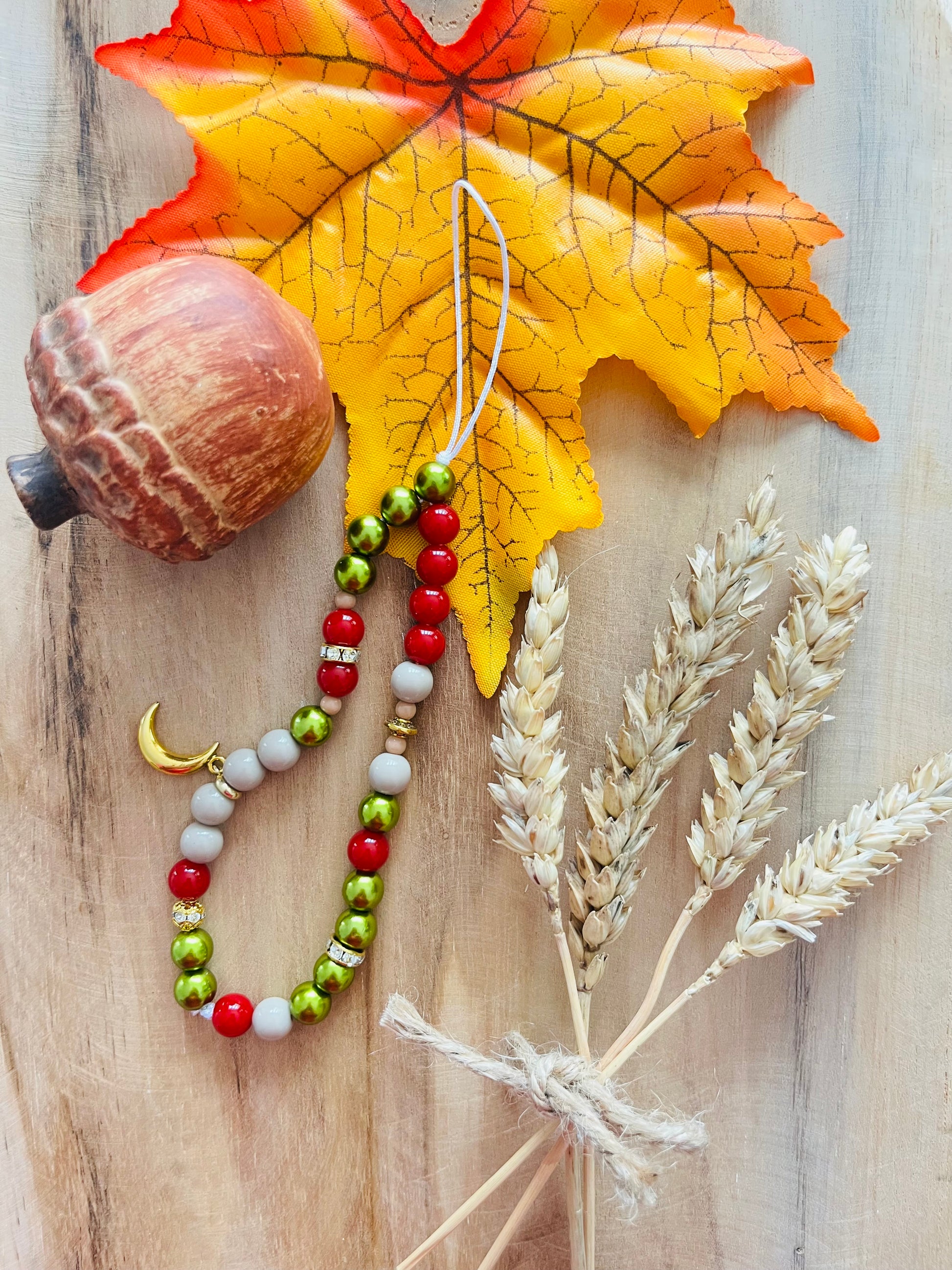 Bijou de téléphone collection SOLANGE en perles fantaisie avec un mini breloque lune doré, réalisé avec un fil en nylon.